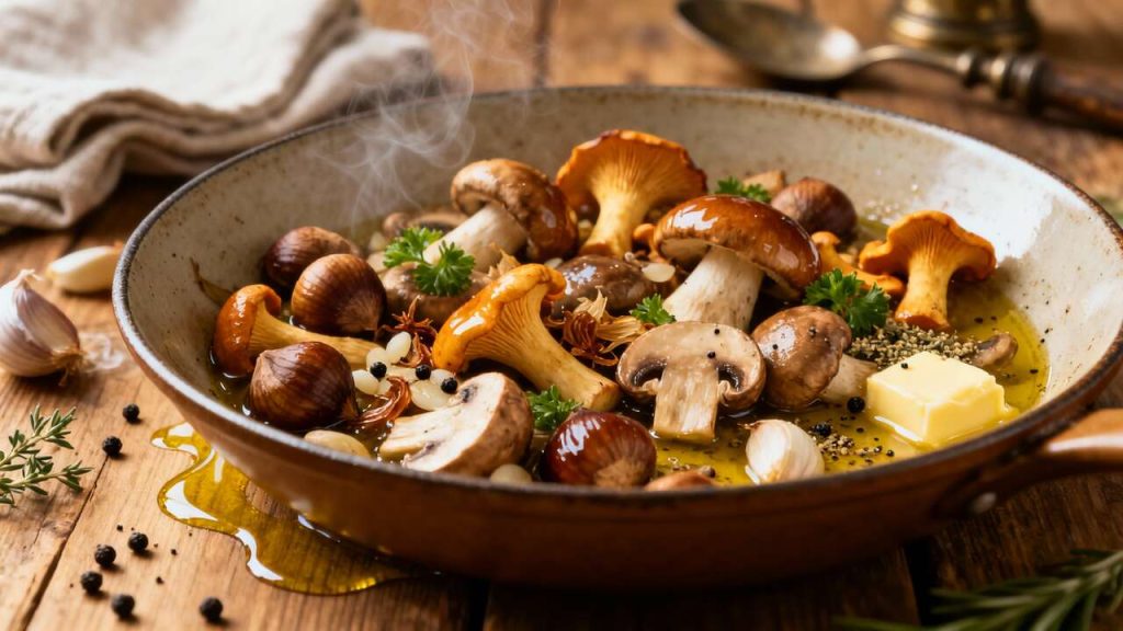 L’association des champignons et des marrons est un grand classique de la cuisine française, particulièrement célébrée durant les fêtes de fin d’année. Elle évoque l’abondance des récoltes d’automne et la cuisine des grands-mères, généreuse et réconfortante. Autrefois, ces deux ingrédients constituaient une base alimentaire importante dans de nombreuses régions rurales d’Europe. Aujourd’hui, cette poêlée est devenue un plat emblématique de la bistronomie, apprécié pour sa simplicité et la richesse de ses saveurs. Sa grande force est sa polyvalence : elle peut être servie comme accompagnement luxueux d’une volaille rôtie ou d’un gibier, mais elle se suffit également à elle-même, servie sur une polenta crémeuse, avec des pâtes fraîches ou simplement du bon pain de campagne pour saucer.